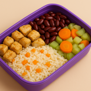 Sobrecoxas de frango em cubos, macias e temperadas, acompanhadas de arroz branco com cenoura e milho + feijão vermelho e salada de chuchu, cenoura, milho, couve-flor e bacon salteados na manteiga. ? Sem lactose | Completa e saborosa!Informações Nutricionais: 481 Kcal - Proteínas 37g - Carboidratos 33g