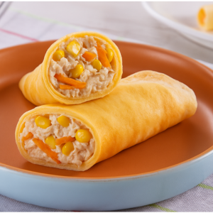 Peito de frango fatiado com cenoura, milho e cheddar derretido, envolto em crepioca macia. Combinação perfeita de sabor e leveza Informações Nutricionais (100g): 206 Kcal - 16g Proteínas - 14g Carboidratos