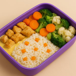 Frango cremoso ao molho de milho, servido com arroz branco temperado com cenoura e milho + legumes no vapor (cenoura, couve-flor e brócolis). ? Saudável, leve e cheio de sabor caseiro! Informações Nutricionais: 371 Kcal - Proteínas 39g - Carboidratos 37g