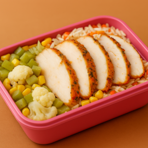 Filé de frango fatiado, bem temperadinho e super suculento. Acompanha arroz branco temperado com cenoura e milho + salada nutritiva de chuchu, cenoura, cebola, couve-flor e bacon salteados na manteiga. ? Refeição completa, saborosa e equilibrada!